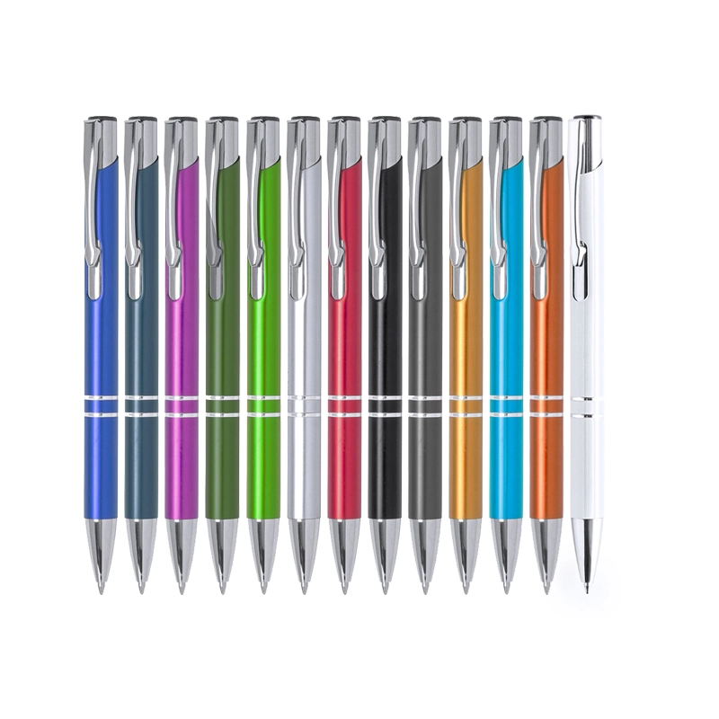 Penna a sfera con meccanismo a pulsante e design bicolore. Fusto in alluminio sagomato con finitura liscia disponibile in diversi colori. Clip, anelli e punta in colore argento. Dotata di cartuccia jumbo con refill blu.