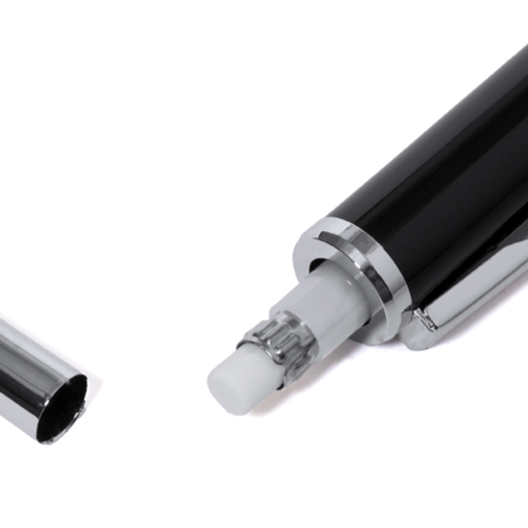 Elegante portamine in ABS nero con impugnatura liscia al tatto ed elementi cromati. Include gomma integrata e mina da 0,7 mm. Ideale per scrittura precisa e utilizzo quotidiano.